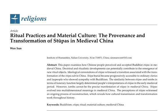 (通讯员 马婧)近日,国际宗教学研究著名期刊Religions(A&HCI, Impact factor 0.8, Citescore 1.1, Journal Rank:Q1 Religious Studies)发表在线买世界杯平台中文系孙雯老师论文“Ritual Practices and Material Culture: The Provenance and Transformation of Stūpas in Medieval China”(《仪式实践与物质文化:中古中国佛塔的缘起与演变》)。