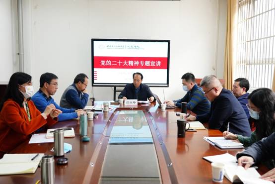 任应坤强调,学习宣传贯彻党的二十大精神,是全校上下当前和今后一个时期的首要政治任务,要读原著、学原文、悟原理,做到全面掌握,融会贯通,尤其是要结合工作实际来学,并就学习贯彻党的二十大精神提出三点建议:一是要全面深入学习贯彻党的二十大精神,用党的二十大精神武装思想指导实践推动工作;二是要以优异工作成绩彰显党的二十大精神的学习宣传贯彻成就,以实际行动推动党的二十大精神落地落实;三是要将党的二十大报告中关于全面从严治党和深化作风建设的要求,切实体现在教书育人的全过程中。