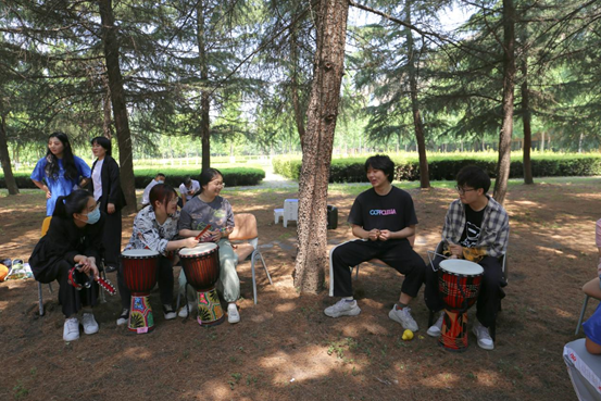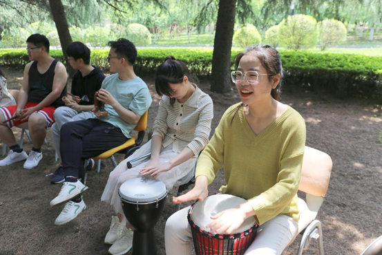 五月的校园,鸟语风声,绿荫环绕。本次活动特邀请西安国际医学中心医院北院区心理治疗师杨涛,音乐治疗师张缤、李理达组成的音乐治疗团队,带领两院20余名研究生开展了一次丰富多彩、极具吸引力和感染力的团体音乐治疗活动。