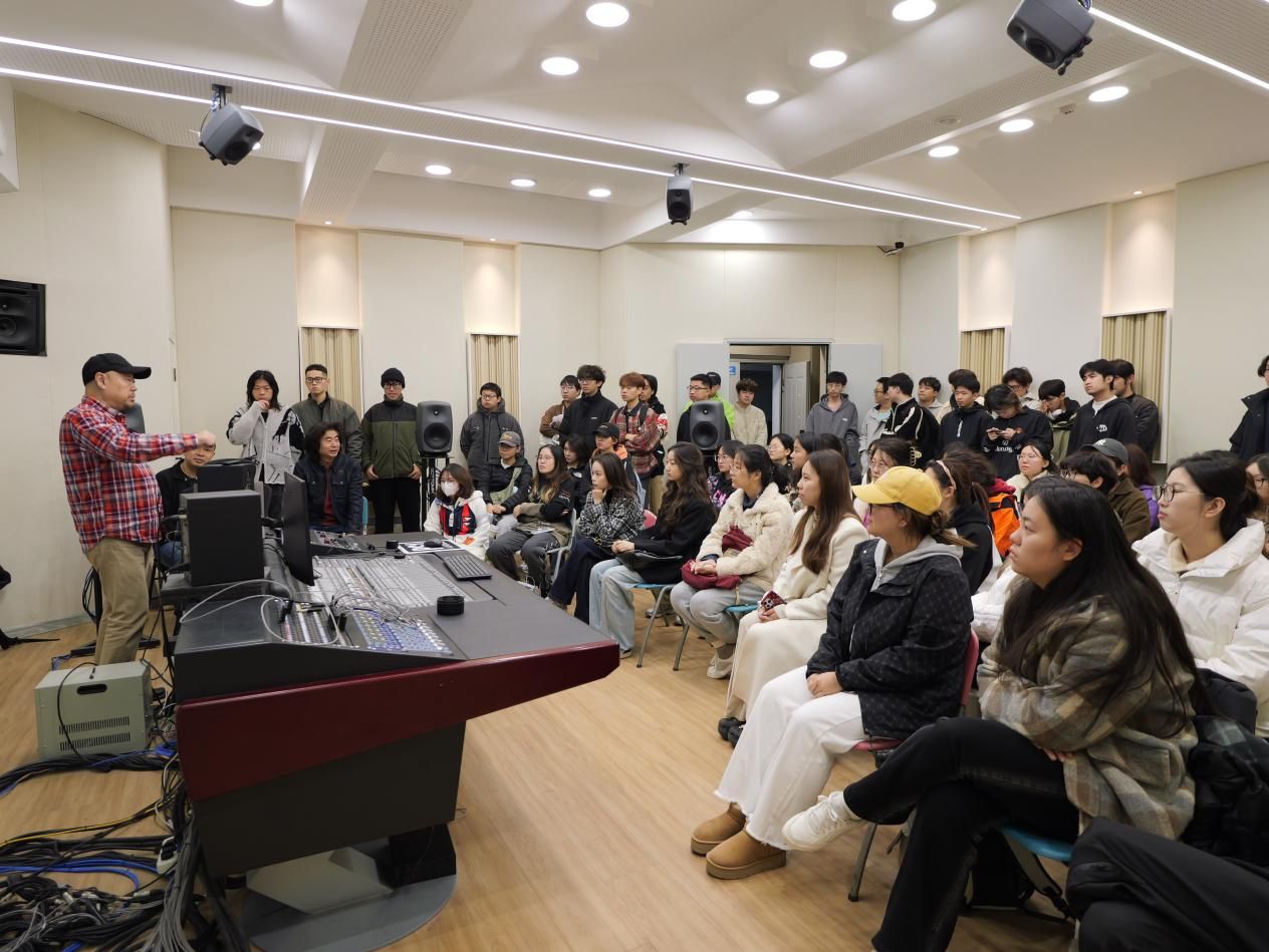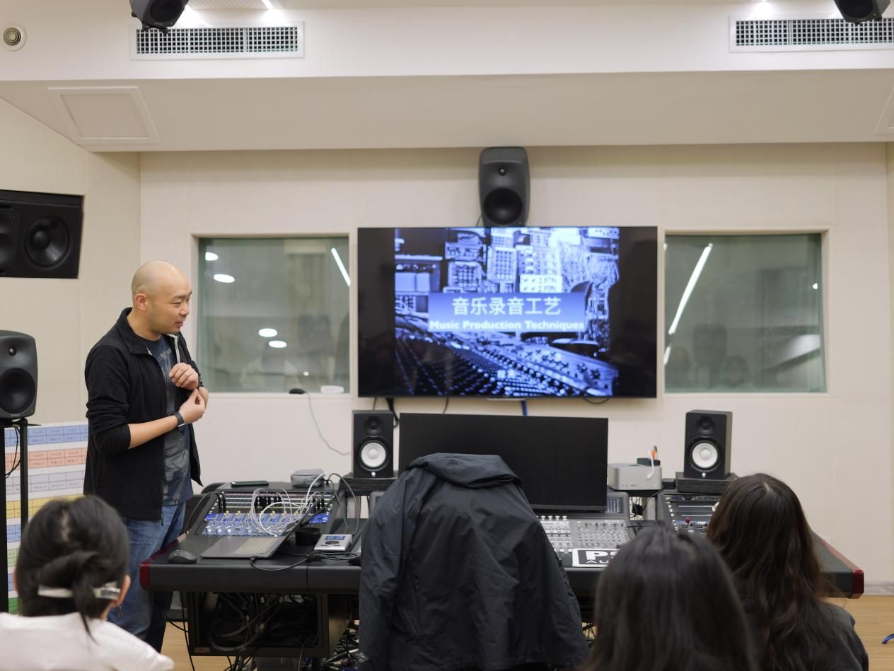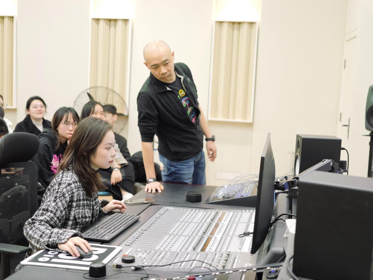 次日,两位老师围绕“音乐录音工艺”与“音乐混音”展开分享,并深入剖析了环绕声与全景声的制作技巧,通过环绕声的发展历程,展望了全景声在现代传媒领域的广阔应用前景,激励学生前沿技术融入学习与实践。学生就自己混音过程中遇到的疑问向娄炜与程亮老师请教,两位老师耐心解答,不仅指出了作品中的亮点与不足,还分享了宝贵的行业经验与个人见解,鼓励学生勇于创新,不断探索。