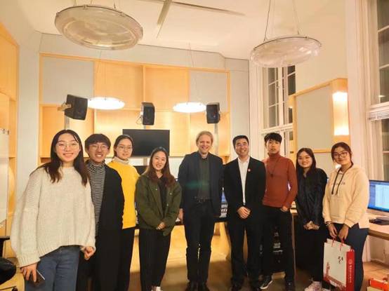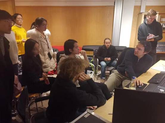 威格尔特教授带领出访团参观了柏林艺术大学多个不同配置的录音棚、音频影视剪辑室、各种录音设备、音乐厅等,并进行了详细介绍,与同学们进行了交流。在一个配置有10.1声道重放系统的录音控制室,出访团成员们欣赏了柏林艺术大学录音团队制作的教堂交响乐同期录音、钢琴与人声录音、摇滚乐等,同学们对环绕声音乐的听感有了新的认识。