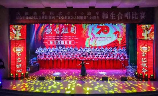 “我和我的祖国,一刻也不能分割,无论我走到哪里,都流出一首赞歌……”礼堂内红色经典歌曲荡气回肠。从《我和我的祖国》到《不忘初心》,合唱团全体师生情绪饱满,气势如虹,高低音部的编排层次分明。既有旋律优美似温情的诉说,又有豪迈大气回荡起伏的气势。