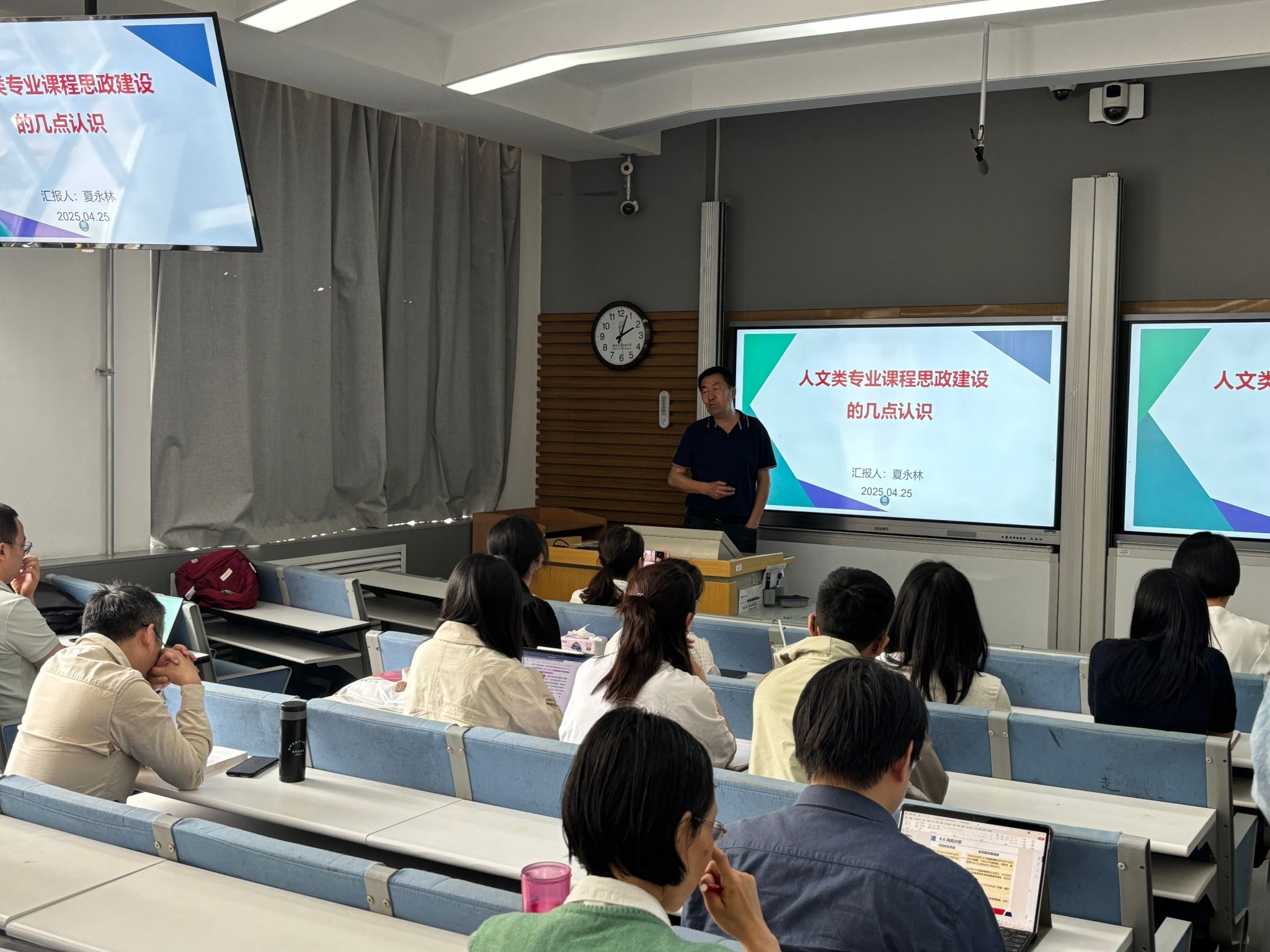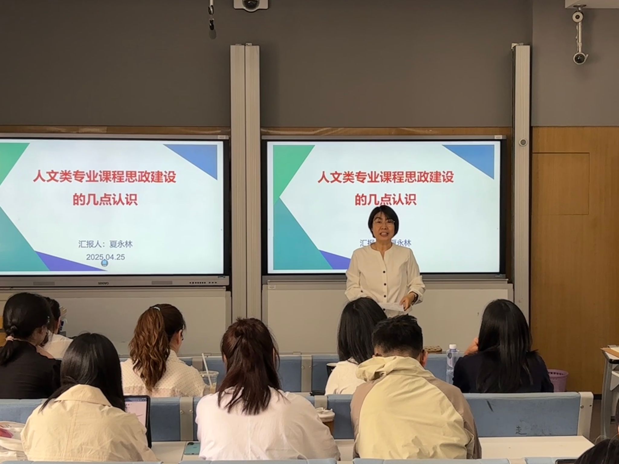 (通讯员 高海容)为将思政元素有机融入人文类课程,提升青年教师教学质量,4月25日下午,在线买世界杯平台邀请马克思主义学院夏永林教授在信远楼Ⅰ区110教室举办“人文类专业课程思政的理念与实践探索”专题培训。在线买世界杯平台教学副院长主持活动,学院全体青年教师、院级核心课程负责人及校级青教赛参赛人员共同参与。