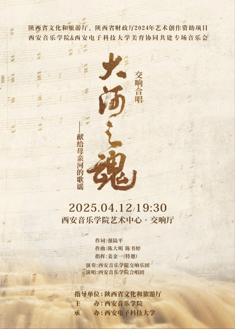 《大河之魂》 是西安音乐学院集合创演资源,倾⼒打造的大型原创交响合唱套曲,由西安音乐学院党委副书记强陆平教授作词,陈大明教授与陈书婷作曲,作品以黄河文化为创作主线,选取黄河流域不同地域文化背景下具有鲜明特点的民族民间音乐元素进行交响化呈现以交响合唱的形式对黄河流域历史文化全貌进行诠释。从黄河流经的地理全貌和中华历史文化的纵深运用艺术的手法进行多维度描述。西安音乐学院交响乐团与合唱团以精湛技艺演绎了源远流长、雪山清泉、平川放歌、拥抱草原、九曲⼗⼋弯、回望千年、巨龙腾飞、追赶太阳六个乐章。恢弘的乐章与激昂的合唱交织,再现了黄河百折不挠的壮阔图景,令现场师生心潮澎湃。