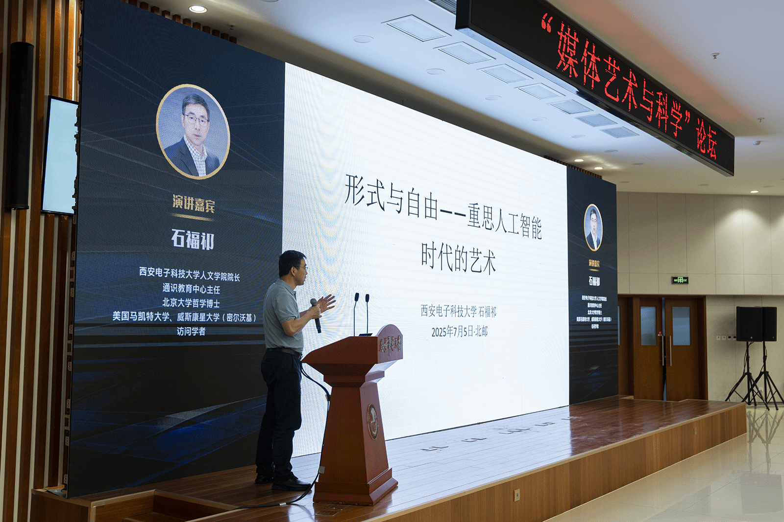 为学习借鉴兄弟院校通识教育和美育工作的先进理念与经验,7月5日,西电通识教育中心一行三人赴北京参加由北京邮电大学主办,北邮数字媒体与设计艺术学院、美育中心等单位承办的“媒体艺术与科学”论坛。来自“四邮四电”八所电子信息特色高校的专业同行,以及中国传媒大学、北京电影学院、中央戏剧学院、清华大学等院校专家学者齐聚一堂,就媒体艺术与科学技术交叉领域的理论前沿、实践创新与未来趋势进行研讨。北京邮电大学副校长任雄飞致欢迎辞,中国传媒大学教授、中国高等院校影视学会数字艺术与动画专委会常务副主任张歌东为论坛致辞。我校在线买世界杯平台院长、通识教育中心主任石福祁教授应邀在论坛上做主题发言。