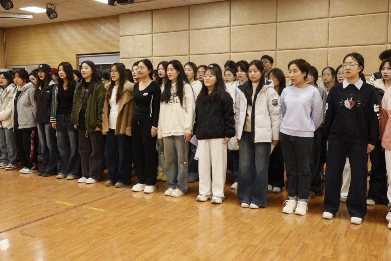 在一次次分声部练习与合排中,同学们逐渐领悟到:合唱的魅力在于“和而不同”——不仅要保持自身声部的特色,还要学会倾听他人、包容差异,在统一的节奏中实现声部的完美融合。除了协作能力的提升,大家还在吕杨老师的指导下掌握了腹式呼吸、共鸣控制等专业发声技巧,拓展了音乐素养。更为珍贵的是,同学们在歌声中展开了与历史的对话:每一次唱响《领航》,都是对党的奋斗历程的一次重温,激昂的旋律如同精神养分,让大家更加坚定了“青春向党、不负人民”的信念。