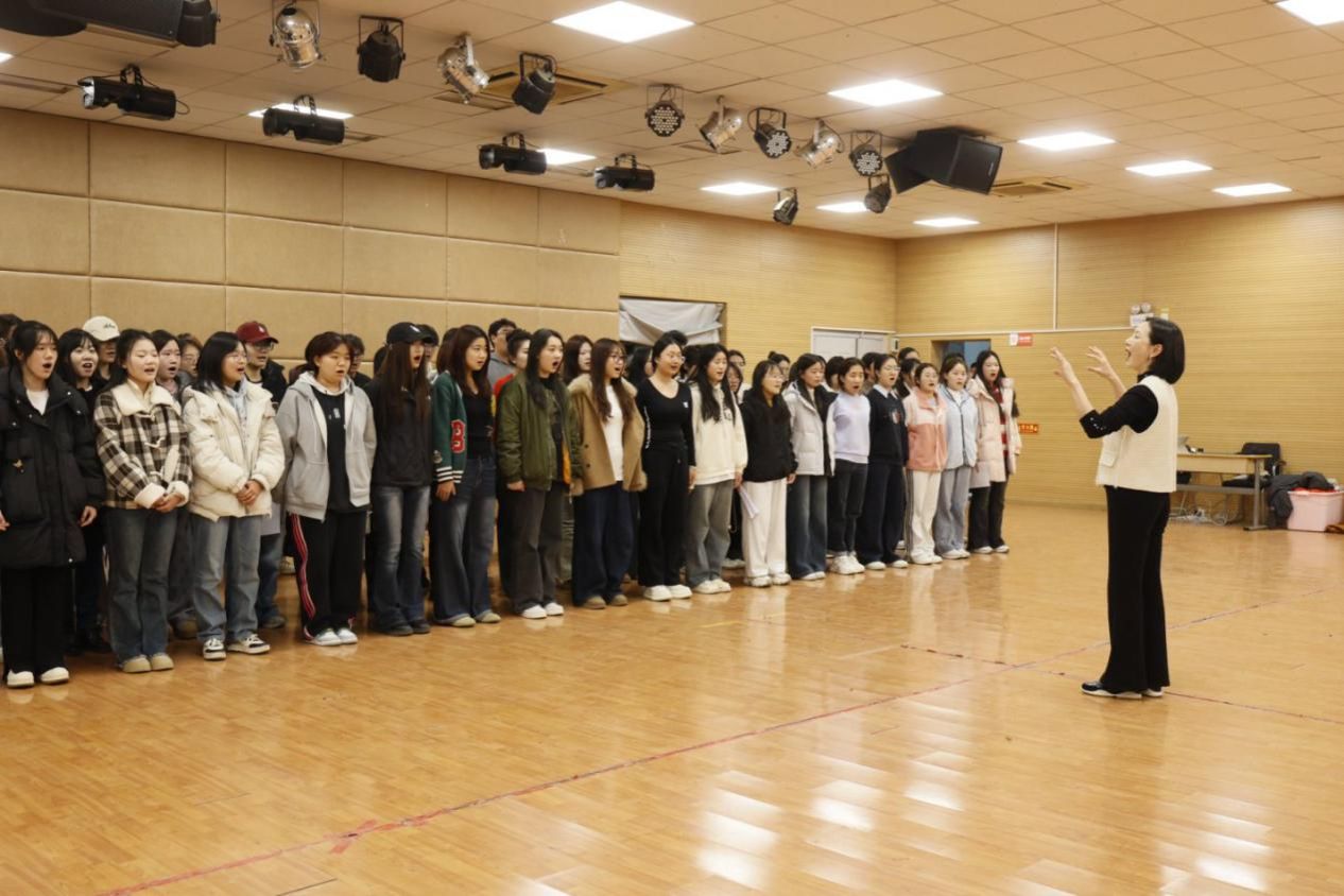 排练过程中,指导老师吕杨以专业的指挥技巧和细致的指导带领同学们逐句打磨。从气息的平稳控制到咬字的清晰饱满,从音符的精准拿捏到节拍的统一规整,每一个细节都力求极致。各声部各担其责、同向发力,共同构成了动人的和声图景:高声部强化高音的穿透与稳定,中低音区锤炼声音厚度与共鸣,大家在老师的带领下逐音校准、修正偏差,全力精进和声效果,共同让《领航》的旋律焕发蓬勃生命力。