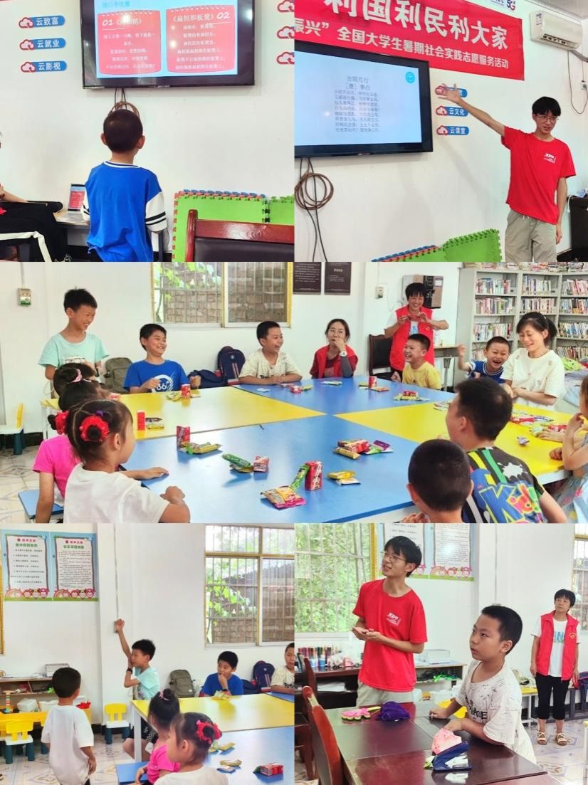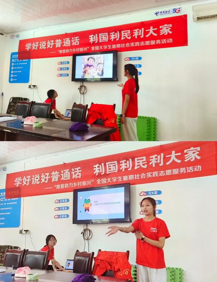在云南省瓦渡乡中心学校,实践队员结合云南地区少数民族众多、方言壁垒突出的特点,设计“推广普通话”专项课程,队员与孩子们共同沉浸式体验方言与普通话之间的异同,以普通话发展时间为线索,回顾中国传统文化中语言的魅力,让普通话在教育中生根发芽。