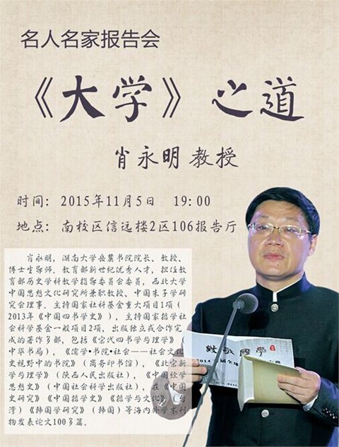 主讲人简介:肖永明,湖南大学岳麓书院院长、教授、博士生导师。教育部新世纪优秀人才,担任教育部历史学科教学指导委员会委员,西北大学中国思想文化研究所兼职教授、中国朱子学研究会理事、主持国家社科基金重大项目1项(2013年,《中国四书学史》),主持国家哲学社会科学基金一般项目2项,出版独立或合作完成的著作多部,包括《宋代四书学与理学》(中华书局),《儒学•书院•社会——社会文化史视野中的书院》(商务印书馆),《北宋新学与理学》(陕西人民出版社),《中国经学思想史》(中国社会科学出版社),在《中国史研究》《中国哲学史》《哲学与文化》(台湾)《韩国学研究》(韩国)等海内外学术刊物发表论文100多篇。