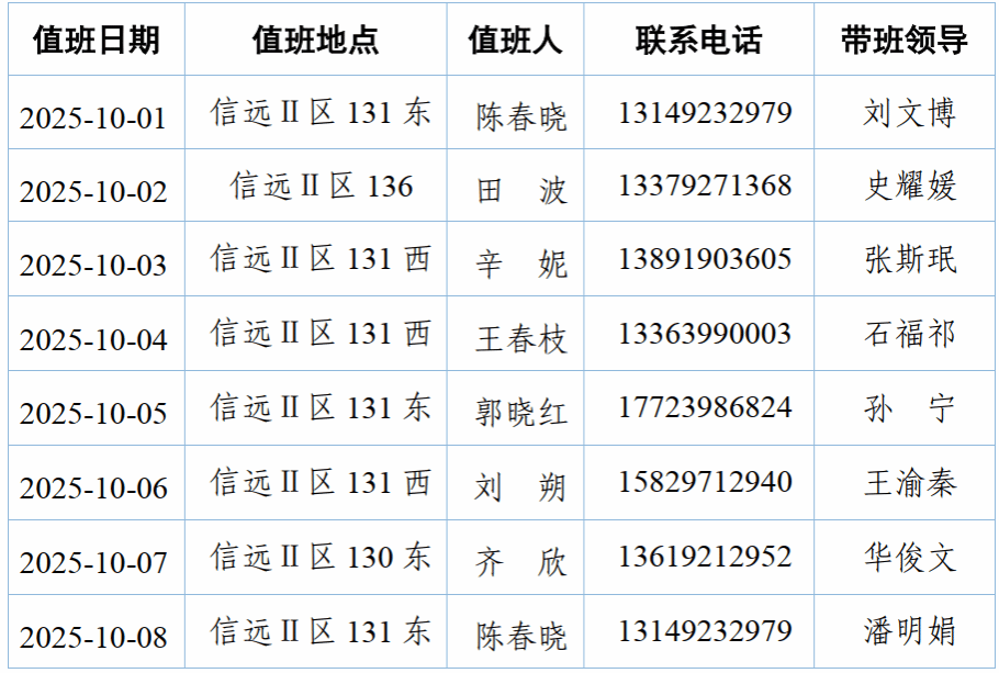 按照学校《关于2025年国庆节、中秋节放假时间安排的通知》要求,现将学院2025年国庆节、中秋节假期值班安排如下: