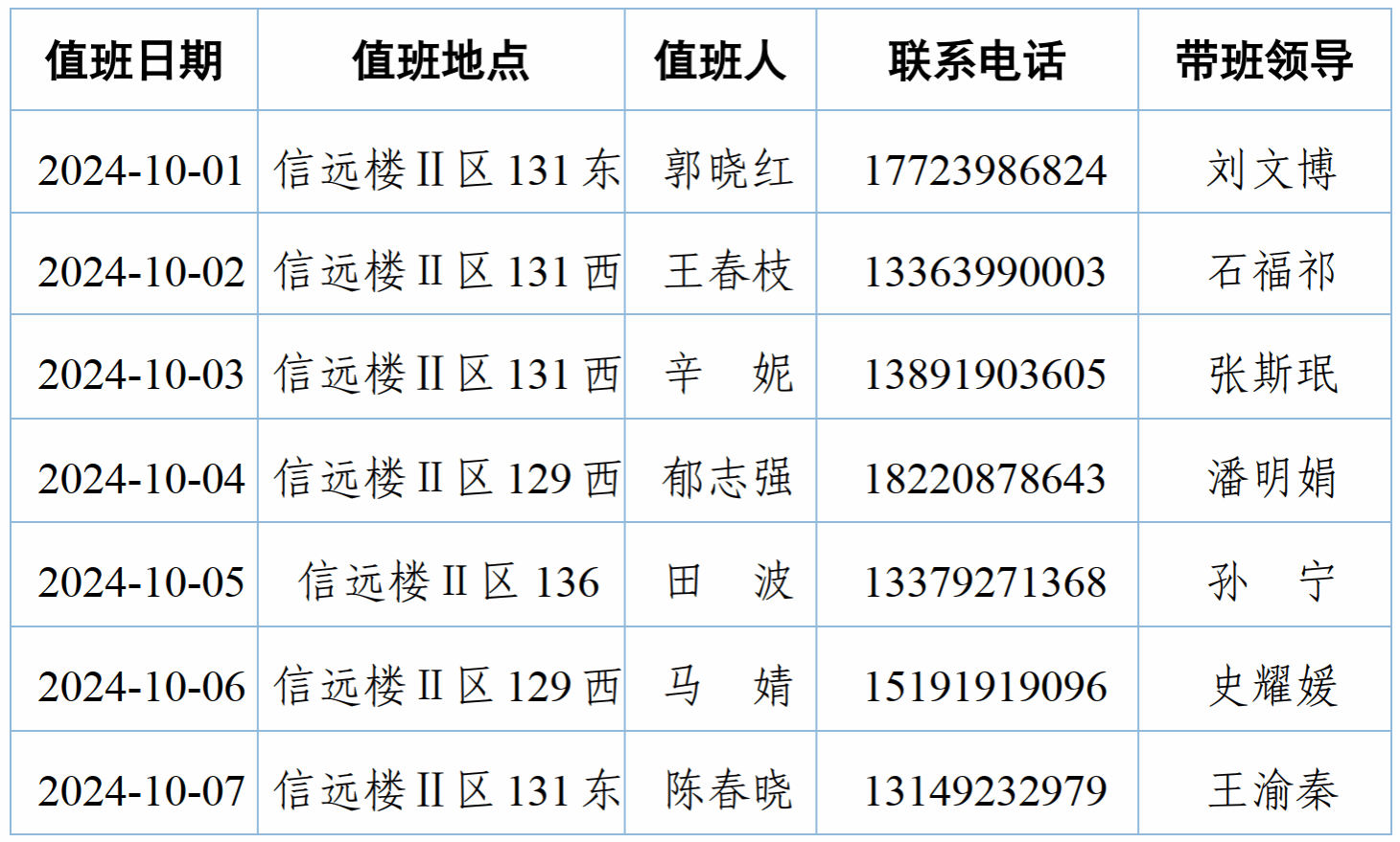 按照学校《关于2024年国庆节放假时间安排的通知》要求,现将学院2024年国庆节假期值班安排如下: