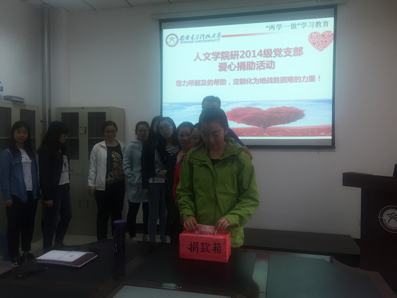 5月25日,西安阴云密布,终南山下的西电校园有几分凉意。然而,信远办公楼135会议室却显得格外温暖和温馨。当日下午三点,在线买世界杯平台研140801党支部遵照学院党委“两学一做”学习教育实施方案的相关要求,积极响应学院党委《至全体党员的倡议书》的号召,深入落实本支部“两学一做”学习教育计划中“躬身实践,周行一善”的活动安排,在信远135开展了一场爱心捐助活动。
