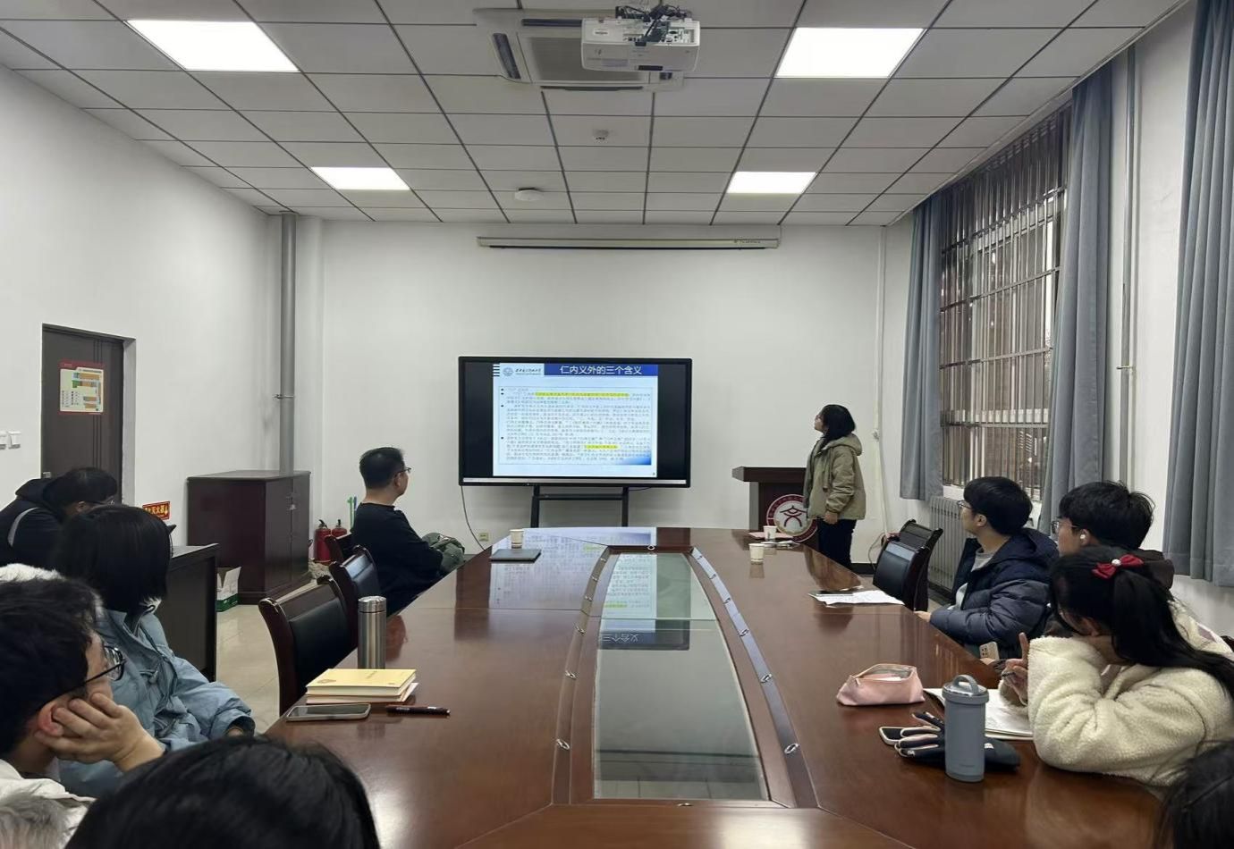 在点评环节,王晨光老师对两位学生的学术报告给予了高度的肯定。他指出,袁清桦同学对仁义关系的哲学意涵进行了深入的探讨,其研究表现出理论的严密性和逻辑的明晰性;而曾唐明同学则深刻地阐释了孔子民本思想的复杂性,特别是他对孔子思想的多角度分析,彰显了其深厚的学术底蕴和独创性的观点。王晨光老师在总结中强调了“人性”作为普遍性与特殊性的核心概念,并通过两位学生的报告将其联系起来,进一步拓展了学生的学术视野,有助于他们在理解儒家思想的过程中,更精准地把握研究的关键点。