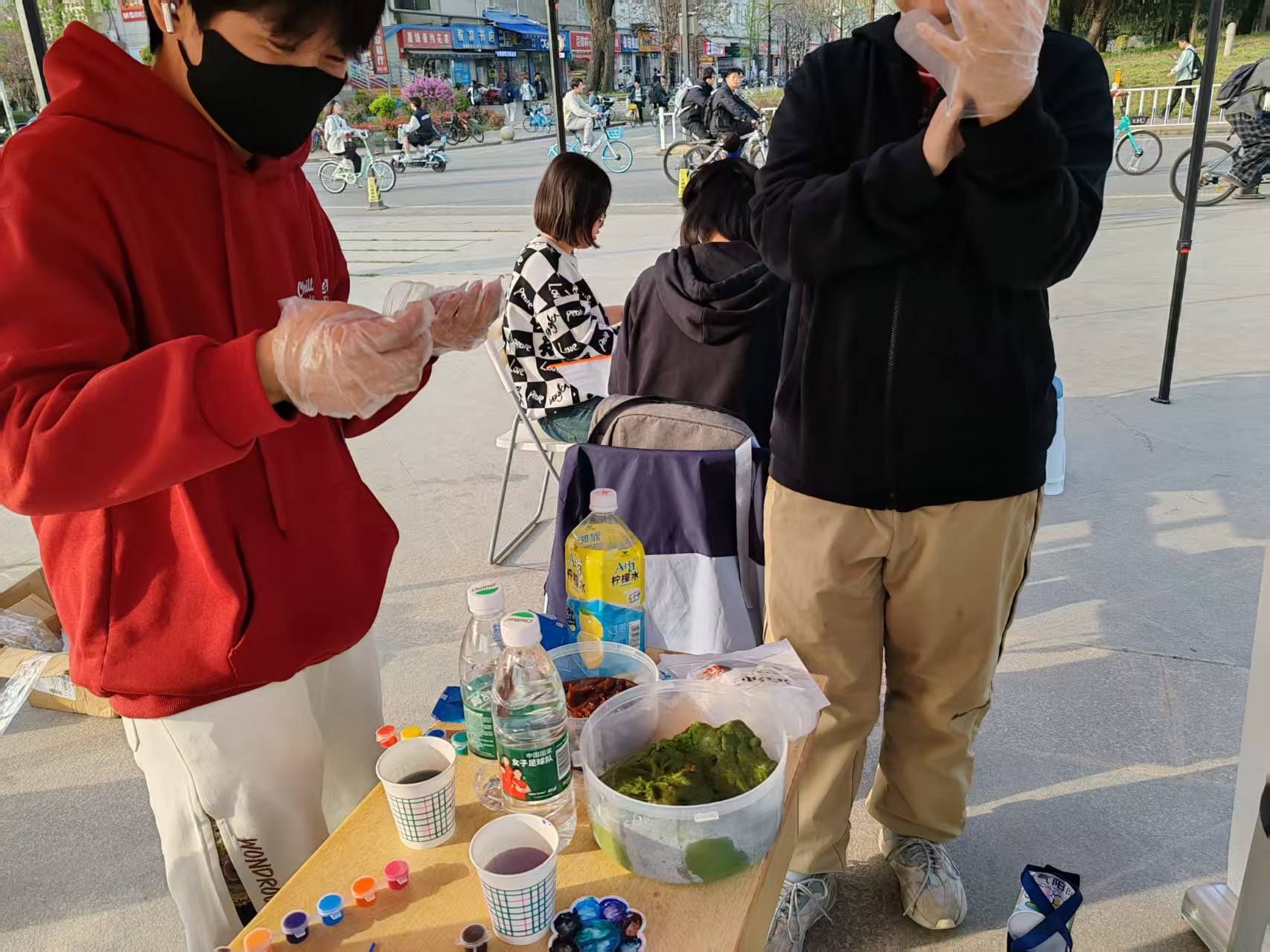 下午4时,礼仪广场化身为露天艺术工坊。素白风筝与缤纷颜料整齐陈列,同学们伏案创作,用画笔在素白风筝上细细勾勒脑海中的图案,将自己对春天的想象画在风筝上。青团与红豆沙泥青红相映,显示出春天的色彩。红色的馅料被温柔包裹,透露出清甜、软糯的味道。
